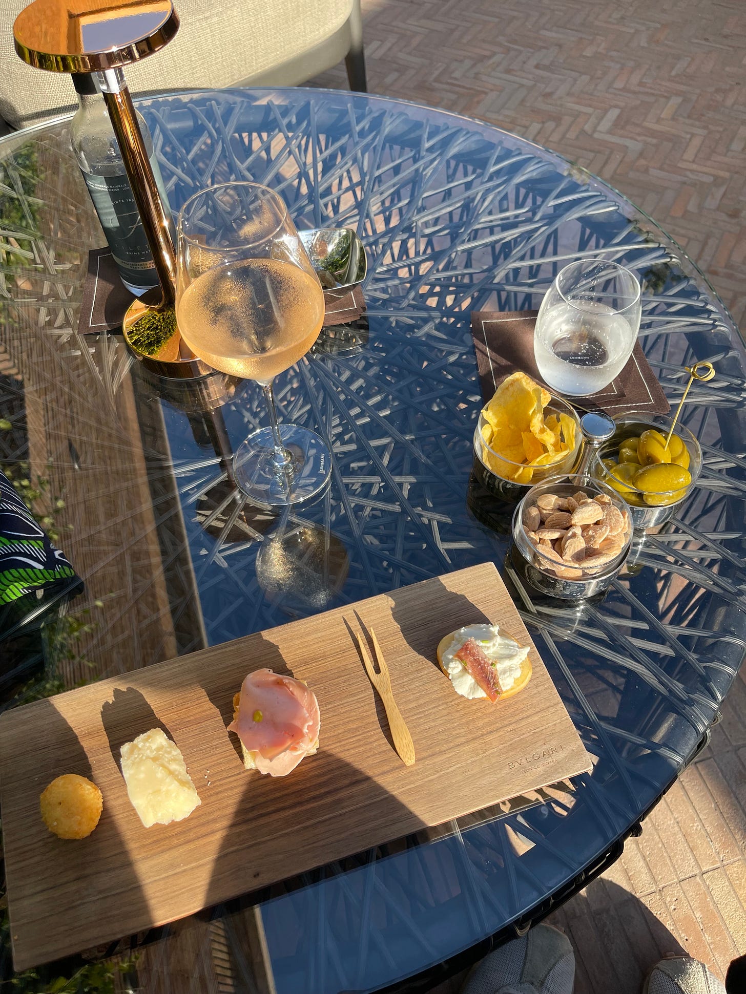 Bvlgari Hotel for aperitivi. I did not stay at Bvlgari. Rooms at Bvlgari in Rome cost 2000 to 9000 euros (that’s about $2331 to $10943) per night. PER NIGHT (not per month or per year). So, I didn’t stay there but my good friend Ali recommended it as a lovely place to get aperitivi. I called in advance to reserve a table and I recommend you do the same. If the weather is sunny, you want to get a table on the 5th floor outdoors or on the rooftop. Of course the rooftop has the most spectacular unobstructed panorama of the city, but the fifth floor has good views too. If you order a cocktail or glass of wine (they have non-alcoholic beverages too) it will cost you about 25 euros but you’ll get chips, olives and nuts to snack on plus, in true Italian style, they send out a complimentary tray of bites including 24 month aged Parmesan, a crostini with ricotta and anchovies, arancini, and a crostino with mortadella. On my second visit, I requested two trays of snacks because they are delicious and I was very hungry. Even though the place is super fancy the staff is quite friendly (not at all snobby) even if you’re not a hotel guest.